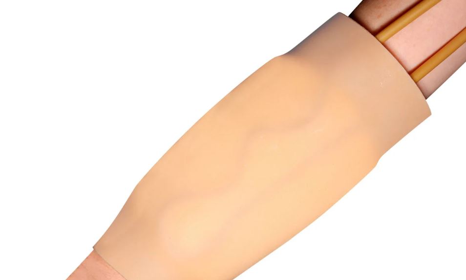 This wearable IV sleeve trainer provides safe, real-life clinical training and can be used on standardized patients, or manikins.